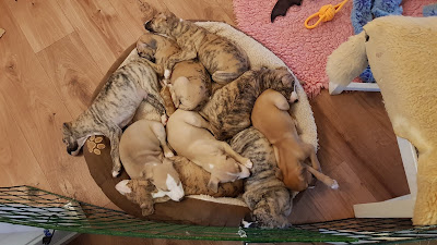 Här kommer lite mysbilder från i fredags när hela gänget gosade ihop sig en och samma dyna efter en massa lek o bus. Mest fokus blev det nog på de tre som söker egna hem.